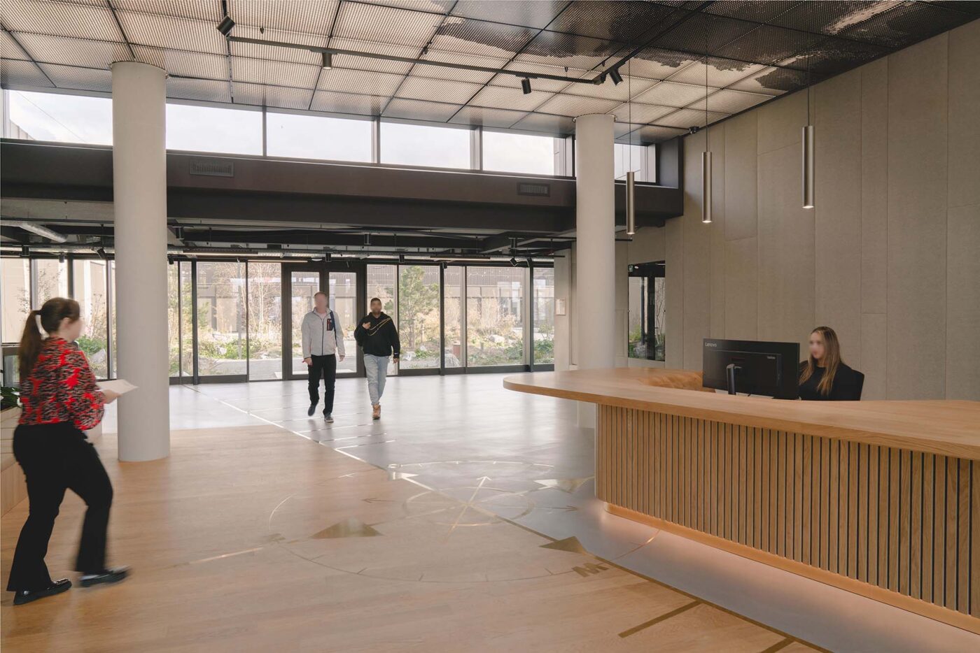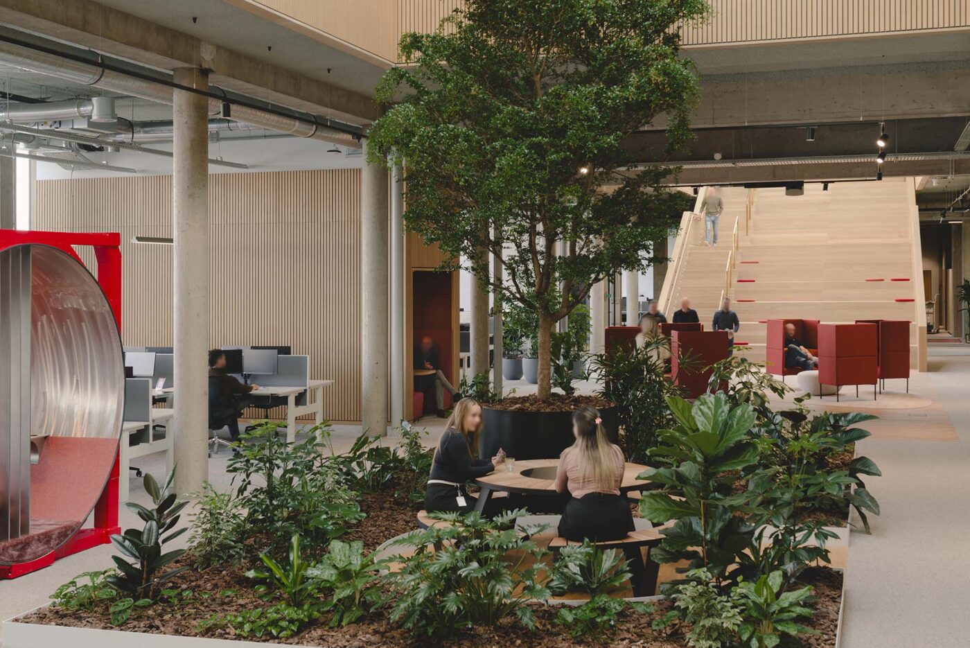 De oude ingang voor vrachtverkeer is getransformeerd tot royale verwelkomende entree met direct zicht op de binnentuin. Geïnspireerd op het contrast tussen de harde kades en de weelderige slikken van de oude rivier is het omliggende terrein een eruptie van de natuur dwars door de betonplaten heen. Frisgroene overplanten die tussen de basaltoever doorschieten. Een industrieel landschap waar de kades weer gebruikt worden door de mensen die er werken. De oude expeditieplaats is getransformeerd tot een luwe verblijfstuin met terras voor het restaurant en flexibele buitenwerkplekken. Verborgen midden in het gebouw ligt deze plek in de luwte van de wind en volop in de zon. Rondom deze tuin ontstaan nieuwe assen die als straten de verschillende gebouwdelen als geheel verbinden. Langs de gevels van het gebouw vormt het terrein een vanzelfsprekend verlengstuk van de haven, gematerialiseerd met inheems groen en basaltstenen.