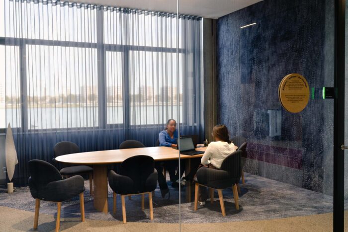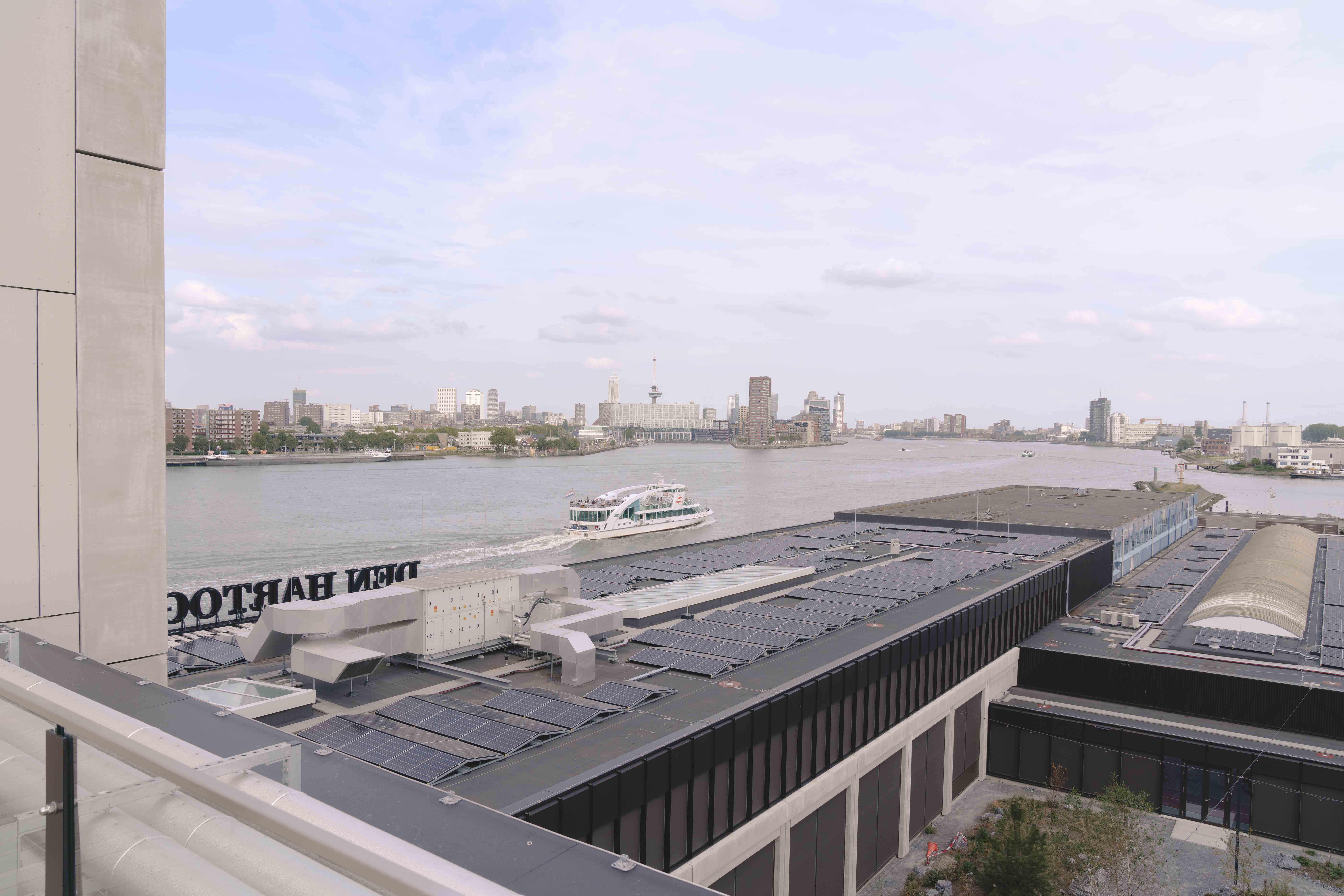 Op de bovenste verdieping een skybar die aanvoelt als een hotelbar; warm, uitnodigend en een tikje mysterieus. Een eigen wereld in de top van het gebouw. Rijke materialen als wortelhout en velours worden gecombineerd met diepe bordeauxrode tinten en opvallende grafische patronen. Het uitzicht over het water geeft een gevoel van vrijheid, terwijl de ruimte zelf je omhult met een warme, verfijnde schil.