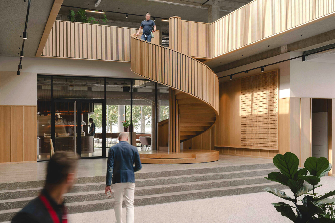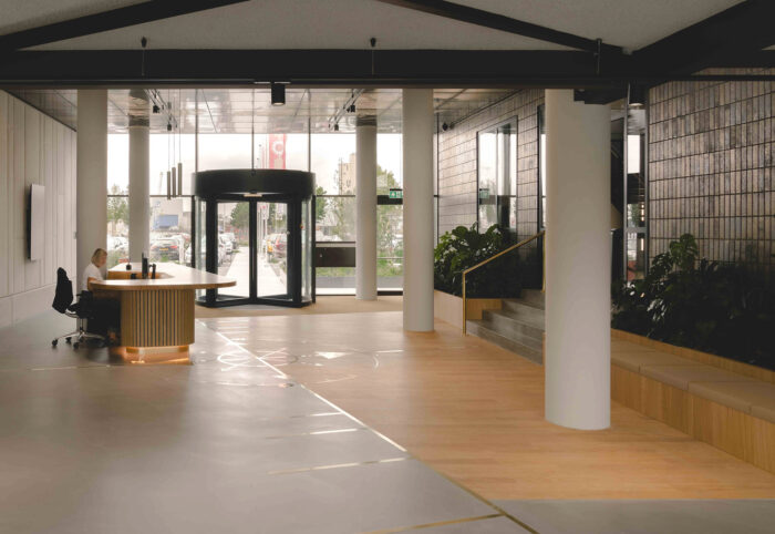 Basecamp is meer dan een werkomgeving: het is een fysieke vertaling van de cultuur van Den Hartogh. De royale nieuwe entree is direct verbonden met een koffiebar; stijlvol ingericht in donkere houttinten en messing details. Een wandvullende vitrinekast toont de rijke historie van het familiebedrijf als levend archief vol objecten en verhalen. Ook de Den Hartogh-visie op fun in business kreeg een ruimtelijke vertaling, een bewuste zoektocht naar de balans tussen werken en ontspannen. Zo leidt de route naar de fitnessruimte langs een eigen renbaan, staat centraal op begane grond een ‘denktank’ in een omgebouwde tankcontainer en wordt in de binnentuin dagelijks een potje jeu-de-boules gespeeld. Verspreid door het gebouw liggen tien karaktervolle stijlkamers, elk geïnspireerd op een facet van de Den Hartogh-cultuur. Er is een zachte vergaderruimte met uitzicht op de binnentuin, een projectkamer met geperforeerde gordijnen die het zicht focussen op een groot scherm, en een creatieve ‘muziekkamer’ vol platen, gameconsoles en brainstormtools. De ruimtes zijn ontworpen voor verschillende momenten in het werkproces – van focus tot co-creatie – en bieden telkens een ander ruimtelijk klimaat. Na werktijd kan er gesport worden bij de in-house fitnessruimte.