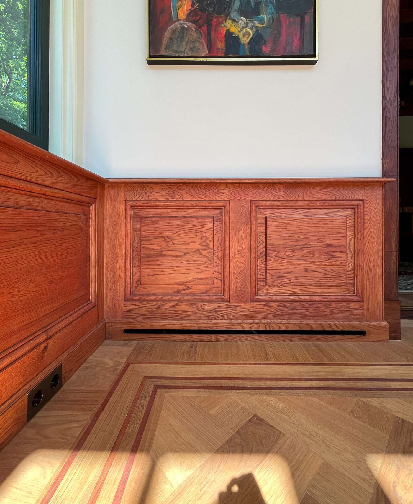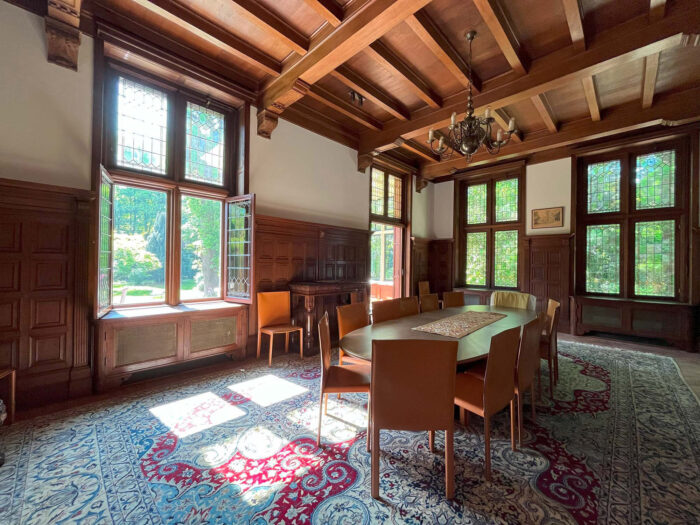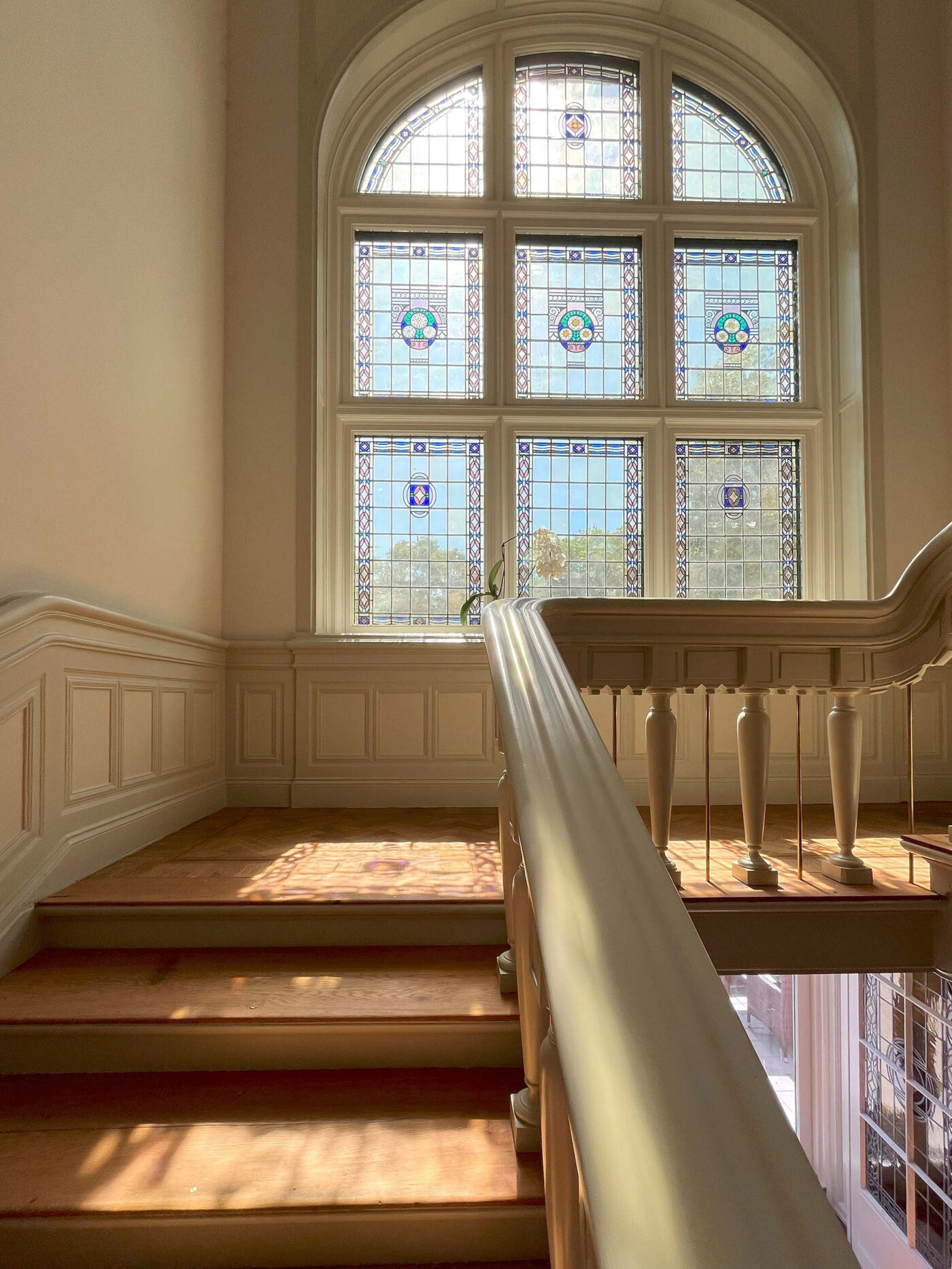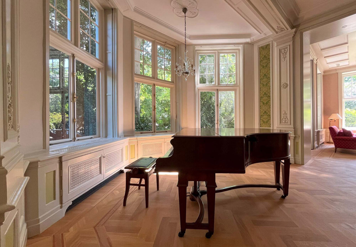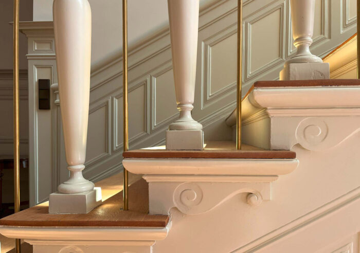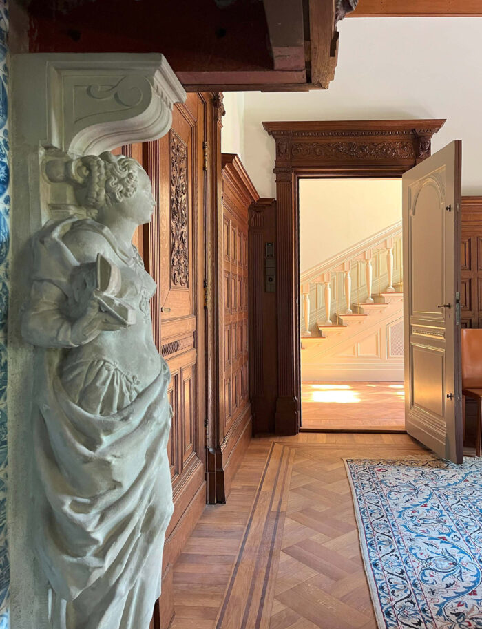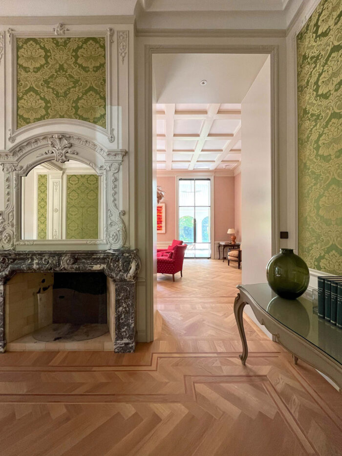 Wat begon als een plan om enkele onderhoudsproblemen aan te pakken, groeide uit tot een integrale restauratie en verduurzaming van de gehele villa. Verouderde installaties en afwerkingen maakten plaats voor hoogwaardige, energiezuinige varianten. Originele details zoals wandbespanningen, geornamenteerde stucplafonds, parketvloeren en lambriseringen zijn zorgvuldig gerestaureerd of naar historisch voorbeeld opnieuw gerealiseerd. Geïnspireerd op de historische pigmenten is een vernieuwde, samenhangende kleurstelling geformuleerd, met behoud van de ruimtelijke hiërarchie. Zo blijven ook de voormalige dienstvertrekken herkenbaar en passend in het geheel.