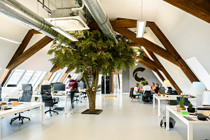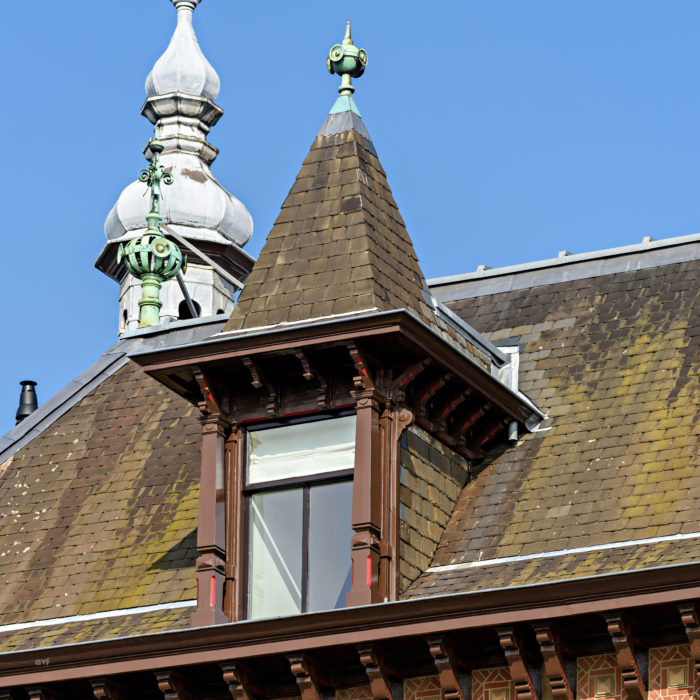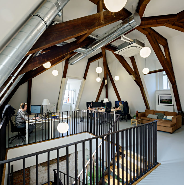 De verdieping en kap van het gebouw, oorspronkelijk gebruikt als dienstwoningen van de stationschef en -opzichter, zijn getransformeerd tot lichte werkruimten, ontsloten door een eigen entree in de toren van het station. De stevige kapconstructie is in het zicht gelaten en op verschillende plekken is zijn de monumentale gemetselde muren onbewerkt in het zicht gelaten. Aan de zijde van het park is over de gehele breedte van de kap een lichtstraat aangebracht die de werkruimten tot een lichte en prettige omgeving maakt. De donkere lamellen laten de lichtstraat aan de buitenzijde op een subtiele manier overgaan in het donkere pannendak. Het monumentale aanzicht van het station aan het stationsplein is volledig gekoesterd en nauwkeurig gerestaureerd. Dankzij historisch kleurenonderzoek is het schilderwerk van de kozijnen, daklijsten en dakkapellen in de oorspronkelijke kleuren hersteld. Ingrepen zijn beperkt tot het toevoegen van daklichten in de zijkanten van de kappen van het midden- en zijpaviljoen.